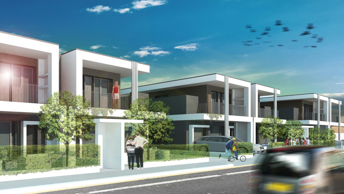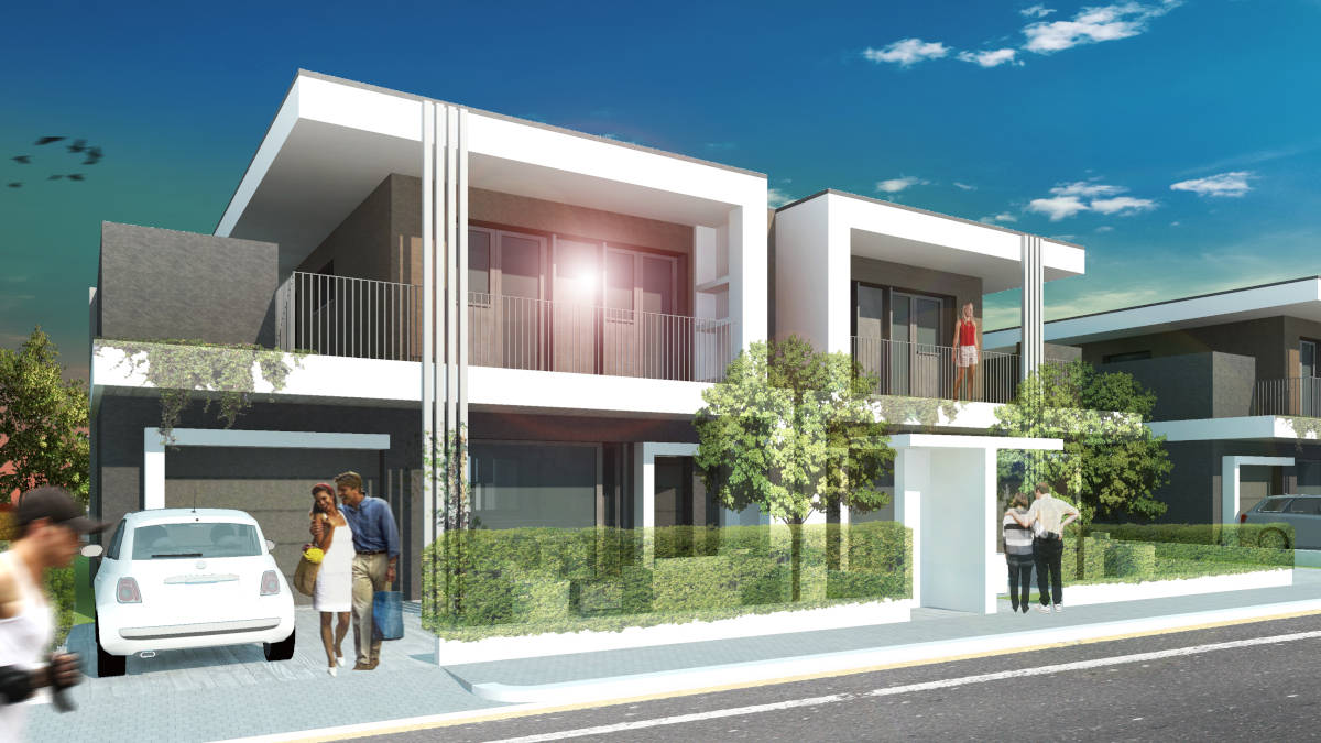 Abbiamo progettato VILLE BIFAMILIARI composte da open space soggiorno, pranzo, cucina, una camera matrimoniale, due camere singole, due bagni, la lavanderia, il garage, un’ampia terrazza attrezzata, il giardino su tre lati, ingresso pedonale e passo carraio indipendenti.